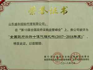 山東盛和招標(biāo)代理有限公司榮獲“全國十佳社會代理機(jī)構(gòu)”四連冠